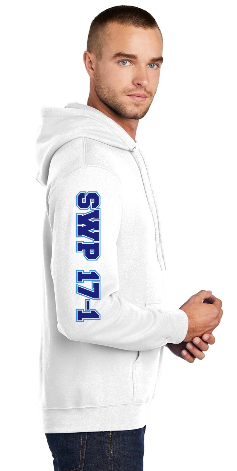 The Lions Jrs. Volleyball SWP 17-1 design will be placed on the Port & Company Core Fleece Pullover Hooded Sweatshirt (50% cotton/50% polyester). The color is White.