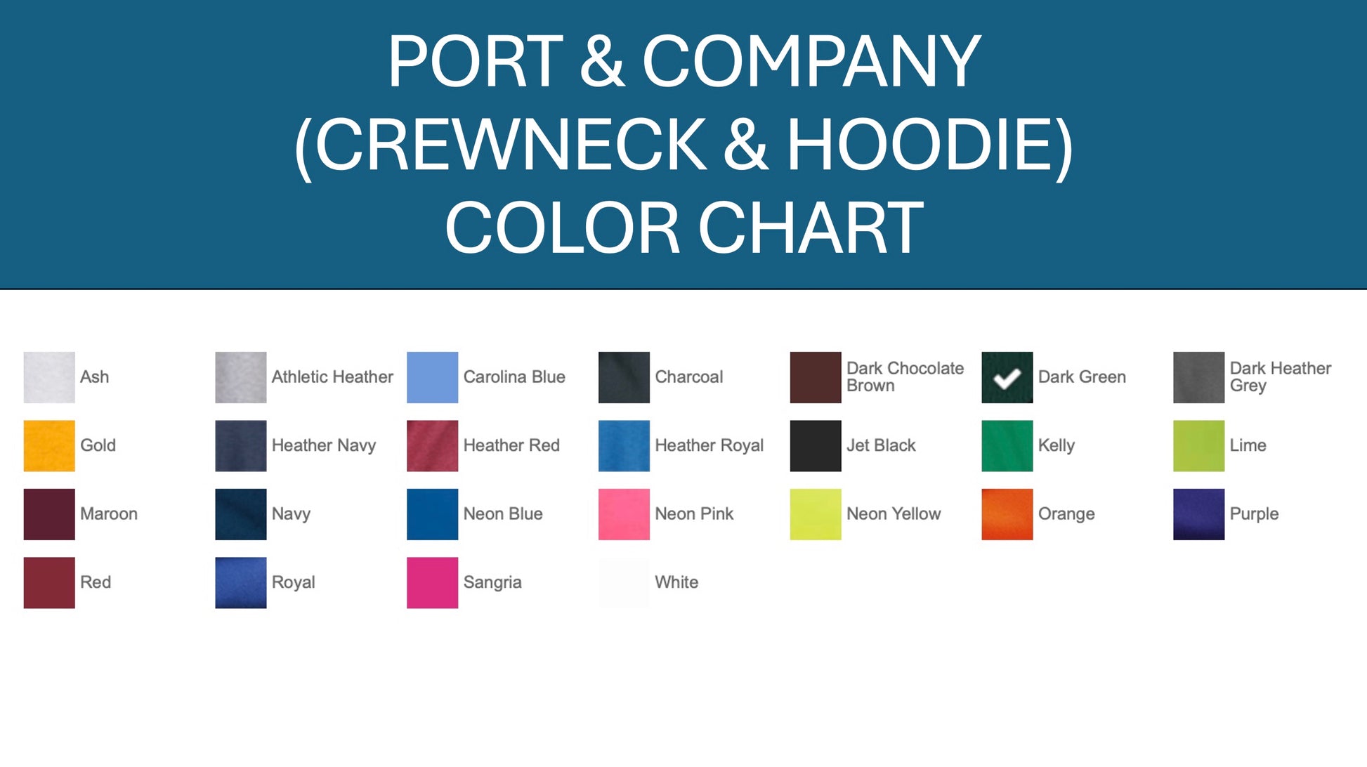If you are ordering a crewneck or hoodie, the design will be placed on either a Port & Company Core Fleece (50/50 cotton/polyester) crewneck or hoodie. Please be sure to select a color from the Port & Company color chart.